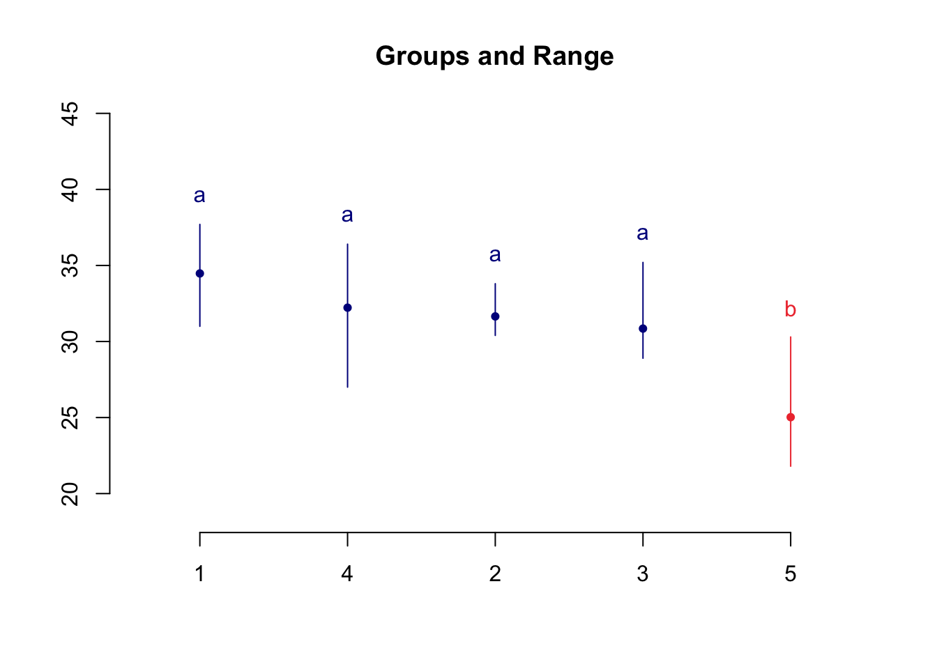 최소유의차(LSD) 방법에 의한 평균의 차이에 대한 결과를 이용하여 처리를 다음과 같이 그룹화 하여 보여줄 수 있다.