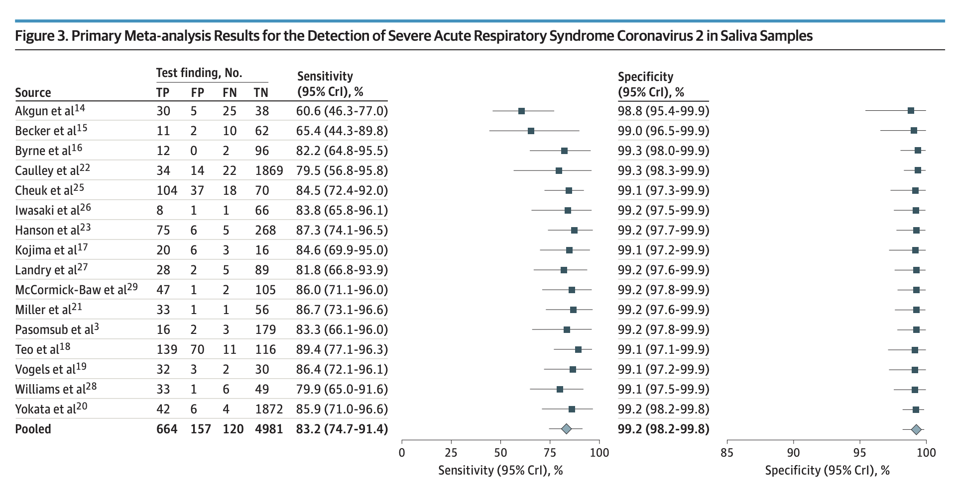 위에서 구한 민감도와 특이도는 Butler-Laporte 기타 (2021) 에서 제시한 민감도(83.2%), 특이도(99.2%) 와 유사하지만 약간의 차이가 있다. 그 이유는 Butler-Laporte 기타 (2021) 는 모든 실험 결과를 단순하게 더한 것이 아니라 메타분석(meta analysis)을 사용하여 얻은 결과이기 때문이다. 메타분석은 같은 주제에 대한 여러 개의 독립적인 연구 결과들을 결합하여 결론을 추론하는 연구 방법이다.