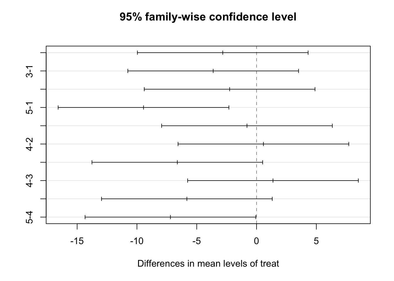 앞에서 살펴본 저혈당 임상실험은 5개의 처리가 있다. 따라서 \({5 \choose 2} =10\) 개의 가설 검정(또는 신뢰구간)을 수행해야 한다.