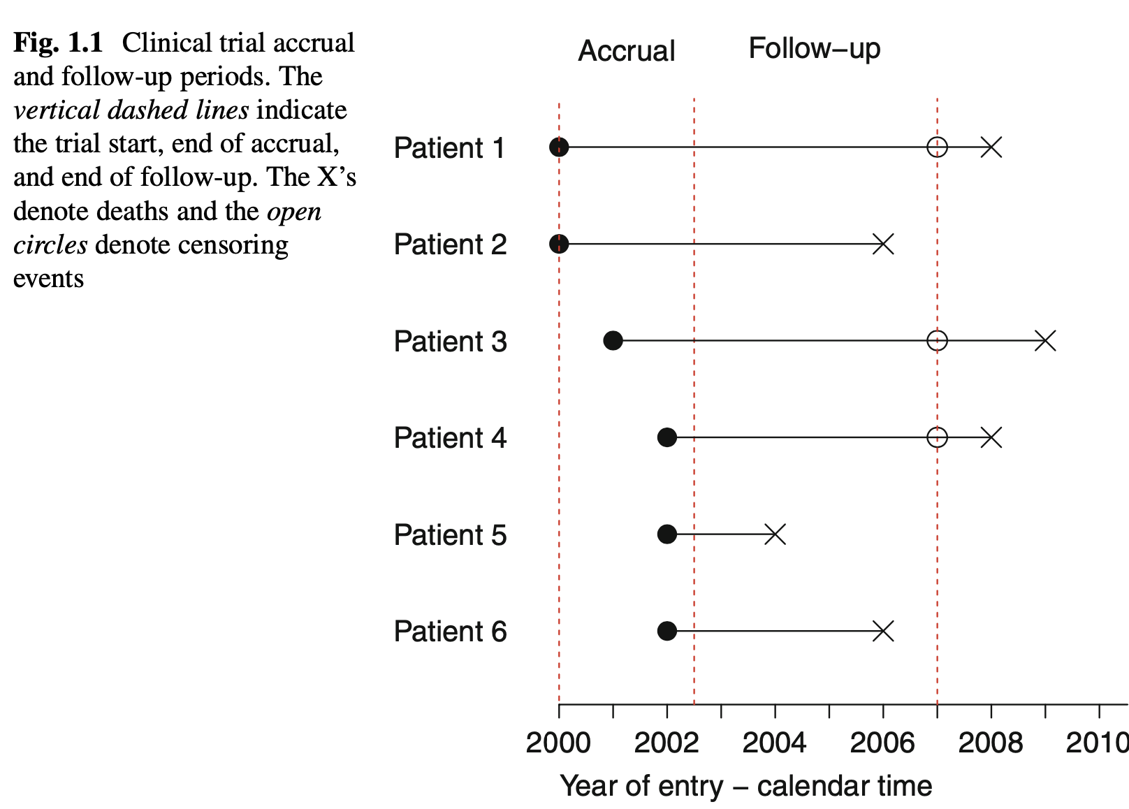 아래 그림은 임상실험에서 중도절단 자료가 발생하는 상황을 단순하게 나타낸 그림이다. 3명의 환자(patient 1,3,4)의 사건이 임상실험 종료후 발생하면 이 환자들의 생존시간은 정확하게 알수 없다.