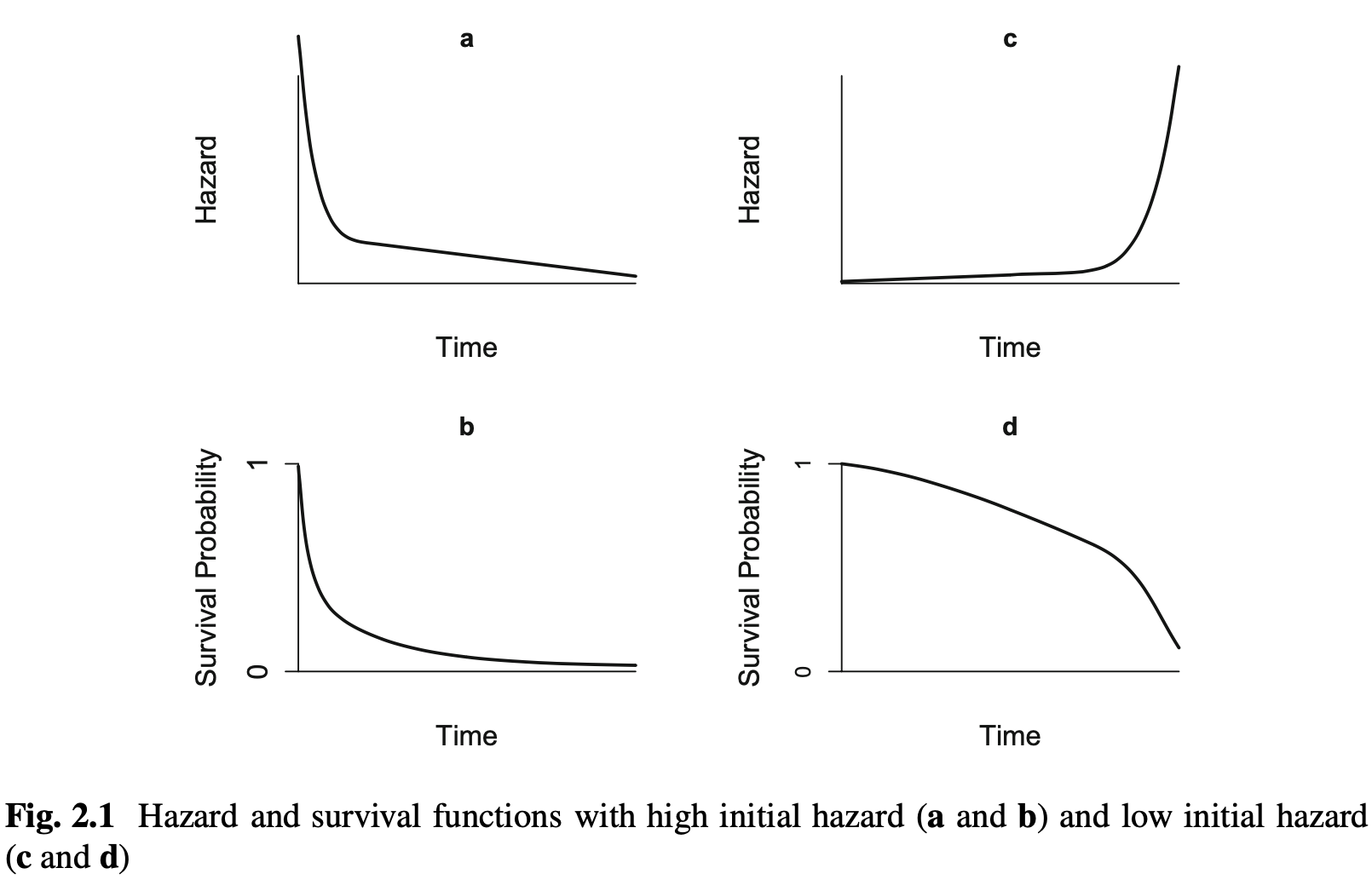 위험함수 9.3 는 아주 짧은 시간에 일어날 사건의 확률로서 순간적인(instantaneous)인 의미를 가진다. 정의에서 보듯이 아주 짧은 시간에 일어나는 극한(\(lim_{dt \rightarrow 0}\))의 의미이다.