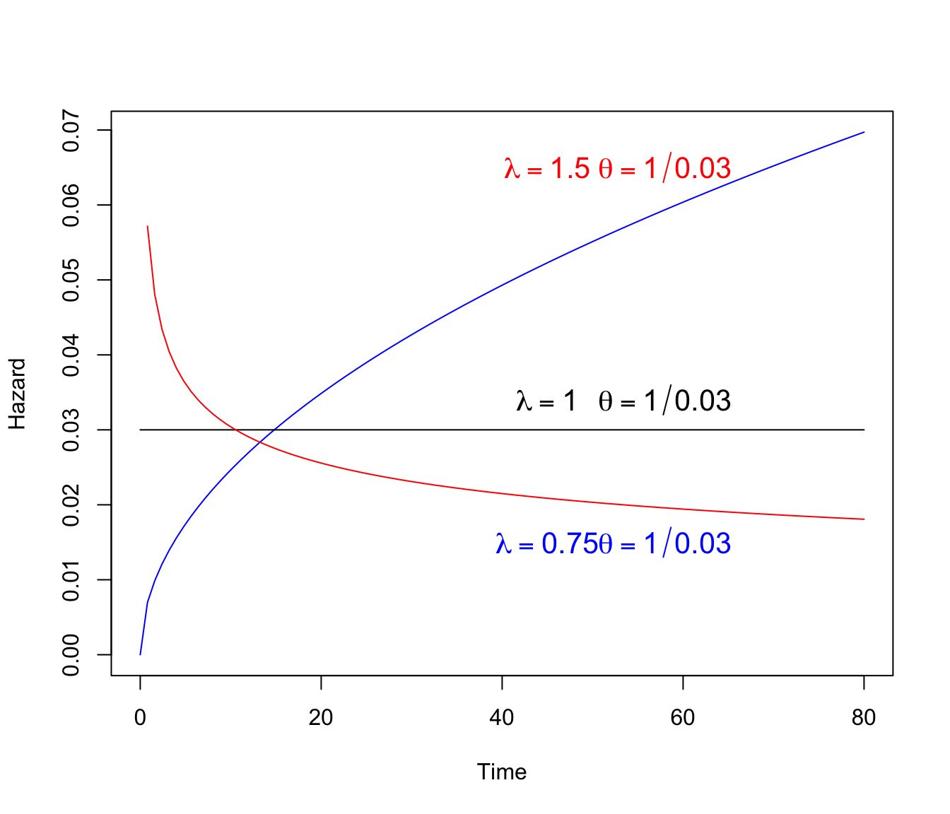 위에서 볼 수 있듯이 \(\lambda=1\)이면 지수분포가 되고 위험함수는 상수이다. 만약에 \(\lambda>1\)이면 위험함수는 시간에 따라 증가하며 \(\lambda<1\)이면 위험함수는 감소한다.