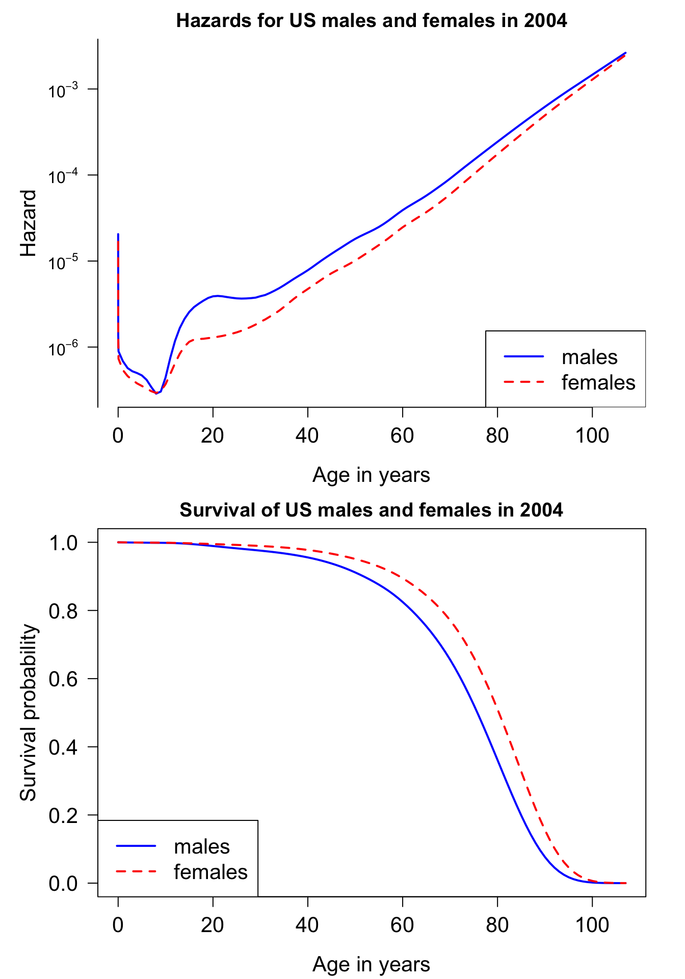 # Figure 2.1.2 log hazard and survival for US males and females in 2004