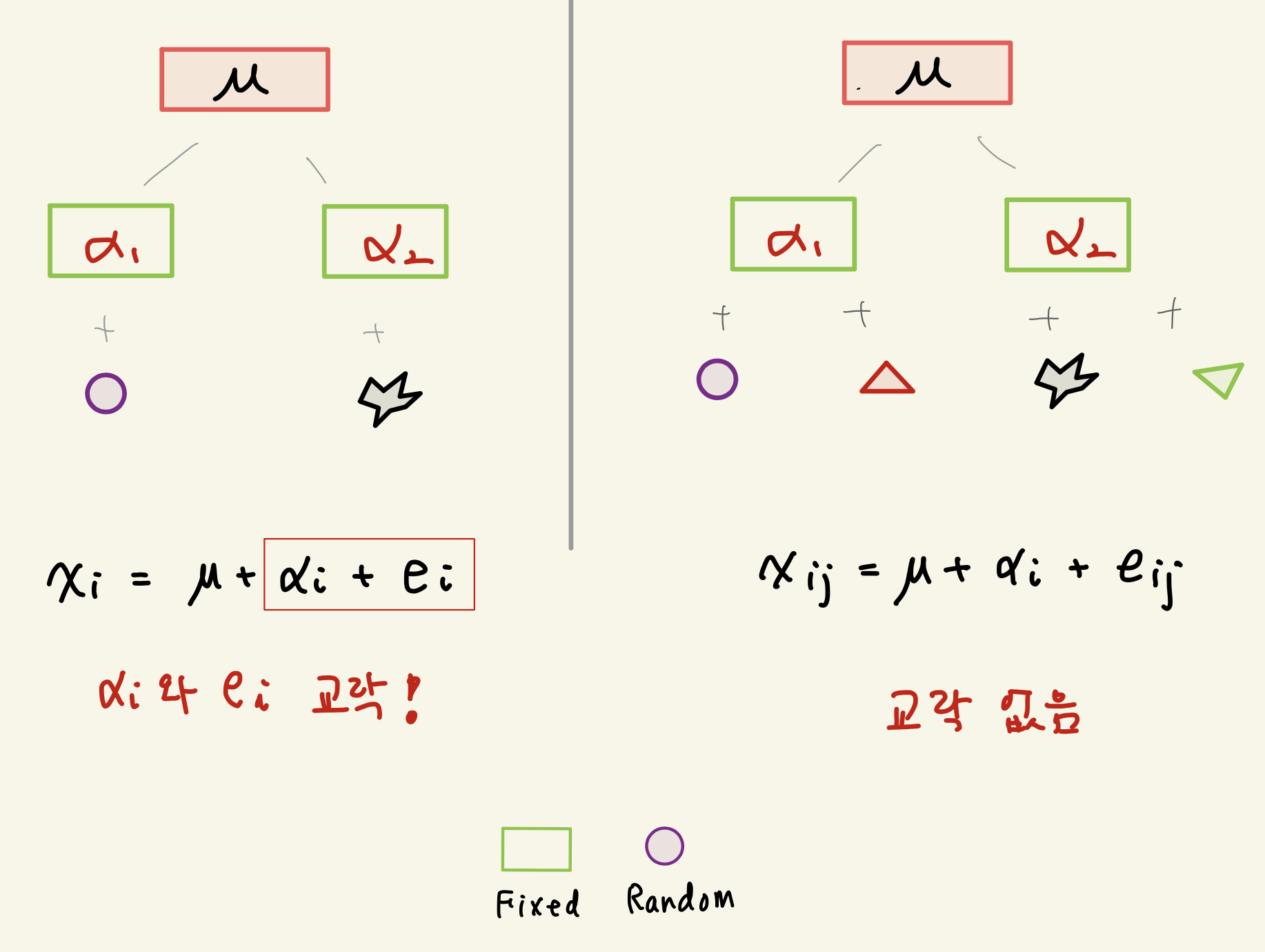 위의 그림에서 반복이 없는 일원배치에서는 처리효과와 실험단위(오차항)가 교락되어 구별할 수 없다.