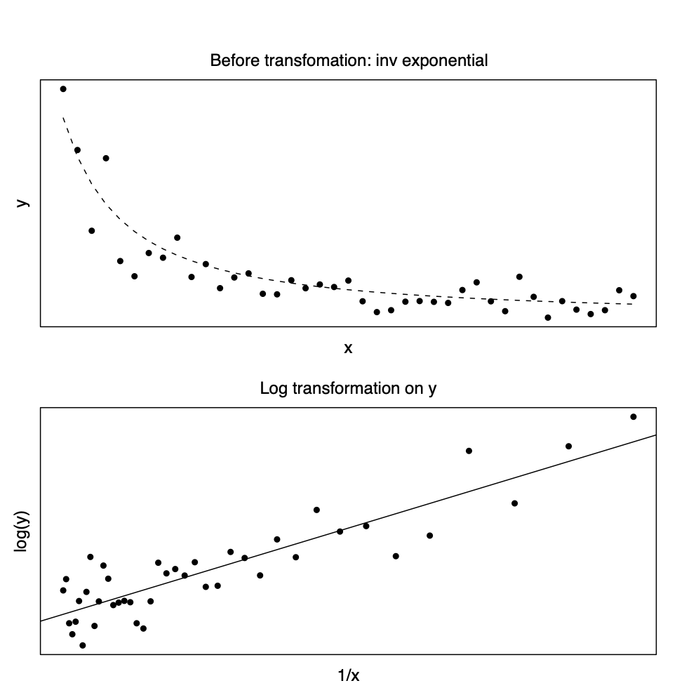 \[ y_i = \beta_0 \exp (\beta_1 x_i) +e_i \quad \Rightarrow \quad \log(y_i) \cong \beta'_0 + \beta_1 x_i + e^*_i \]