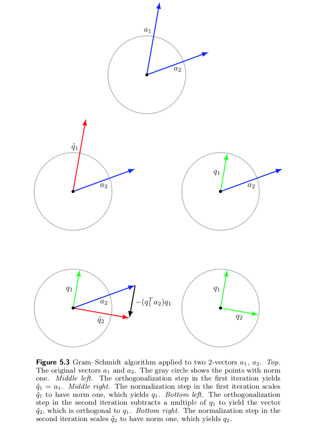 즉 위의 축차식을 보면 원래 벡터 \(\pmb a_i\) 는 Gram–Schmidt 방법으로 구한 정규직교벡터 \(\pmb q_1,\pmb q_2, \dots, \pmb q_p\) 의 선형 조합으로 나타낼 수 있다.