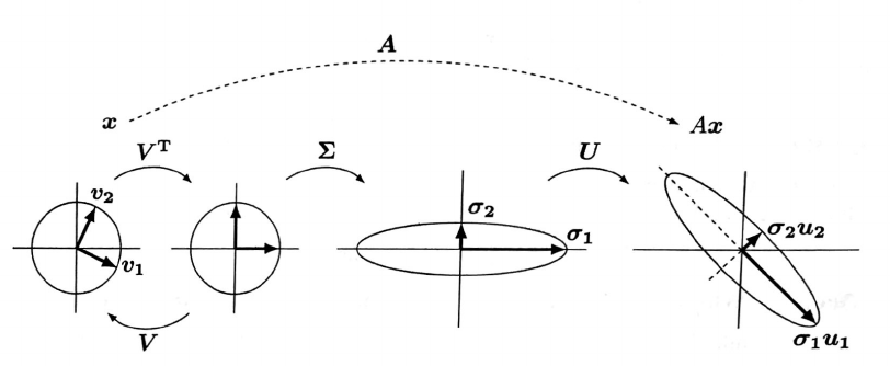 다음은 SVD 분해의 기하학적 의미를 설명한 그림이다.