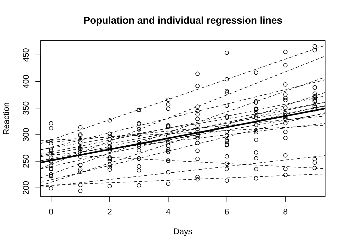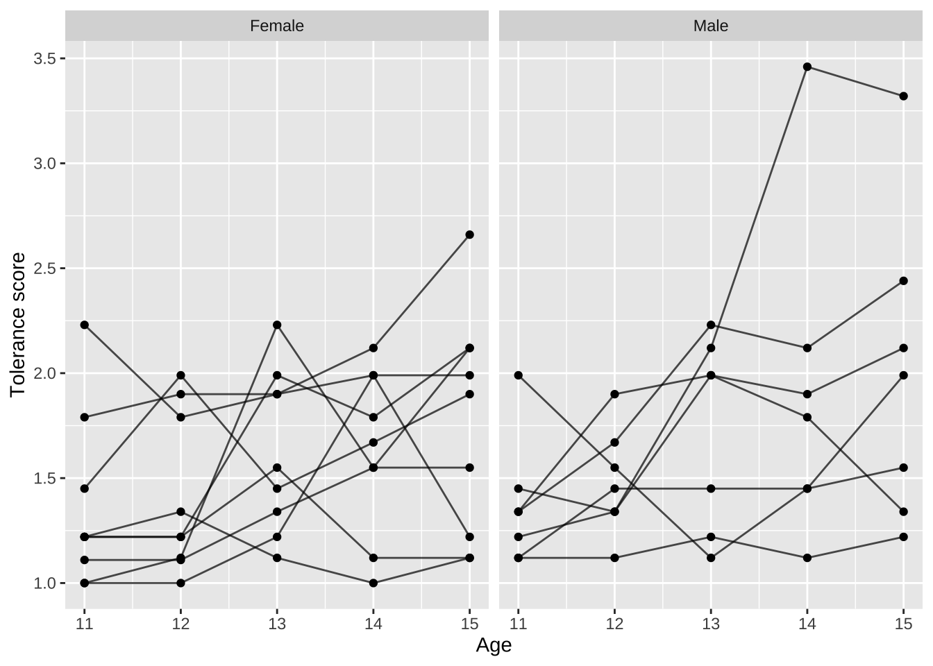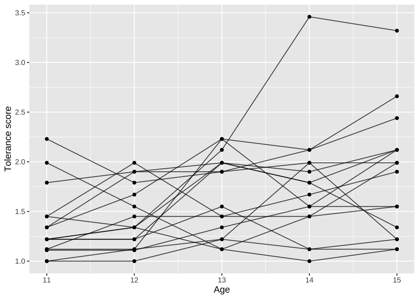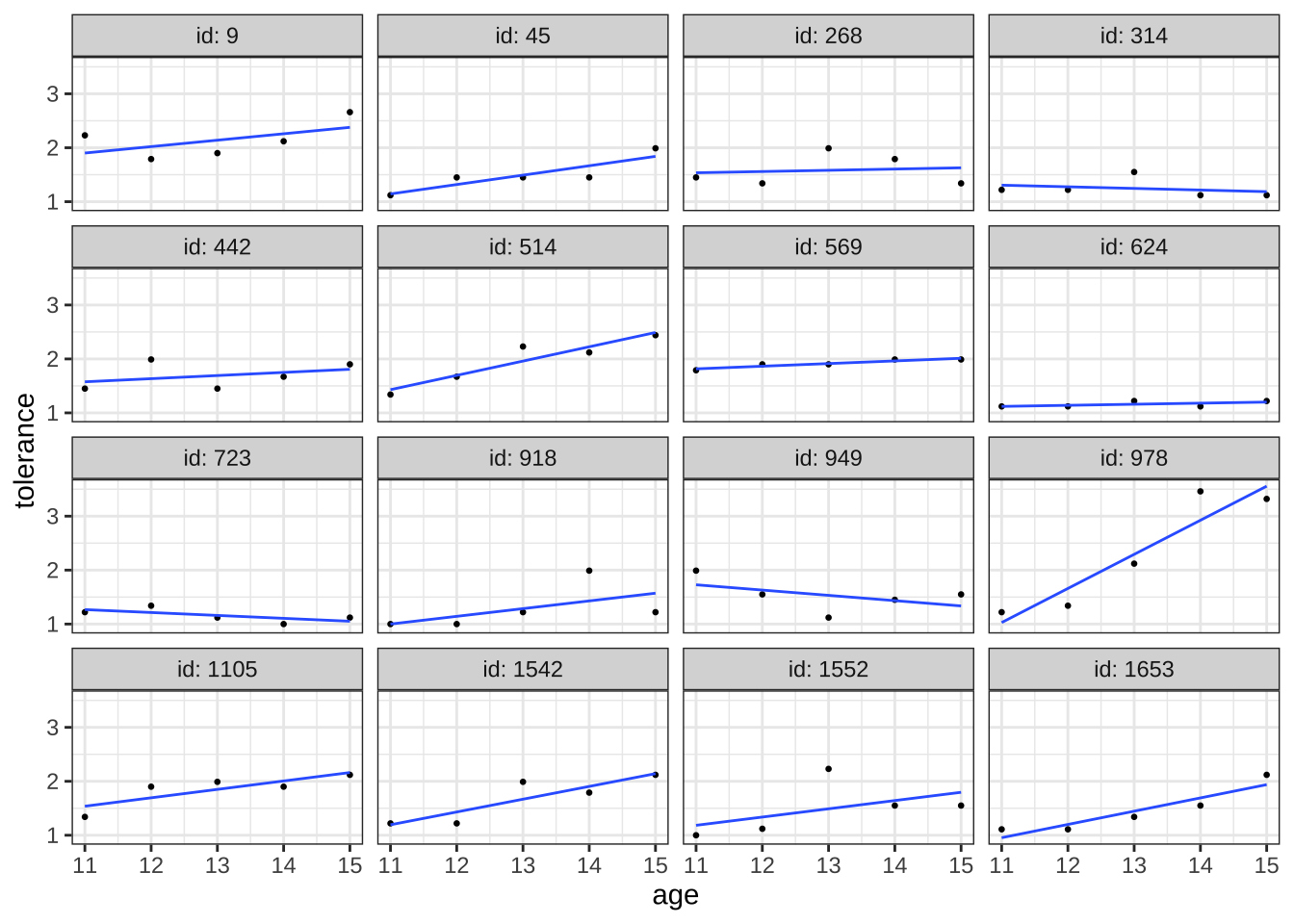 \[ \text{Tolerance}_{ij} = (\beta_0 + b_{0i}) + (\beta_1 + b_{1i}) ~~\text{age}_{ij} + e_{ij} \tag{10.18}\]