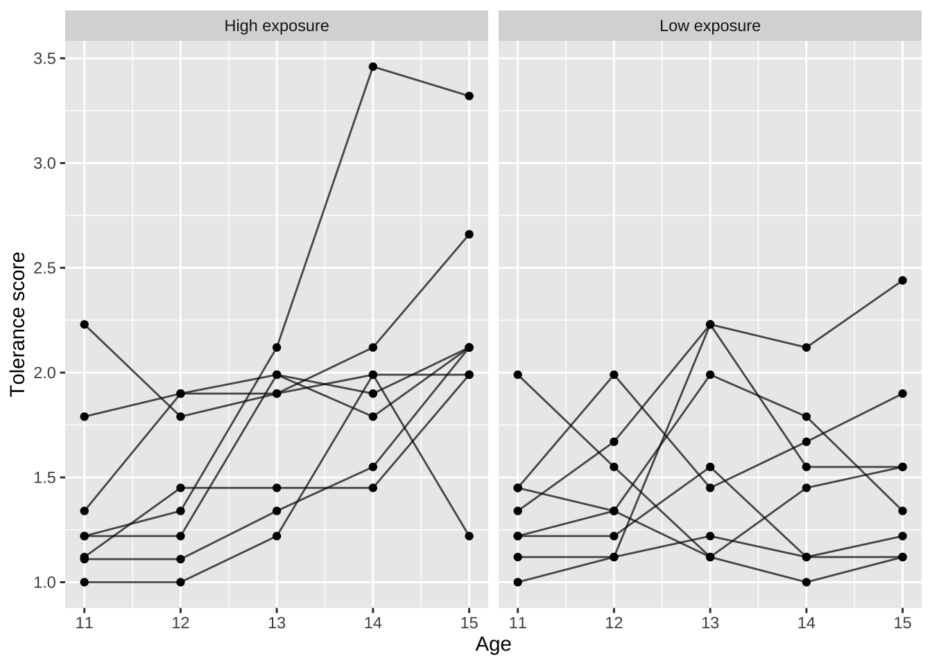 \[ \text{Tolerance}_{ij} = \text{Sex}_k + + (\beta_0 + b_{0i}) + (\beta_1 + b_{1i}) ~~\text{age}_{ij} + \beta_2 ~\text{Exposure} + e_{ij} \tag{10.19}\]