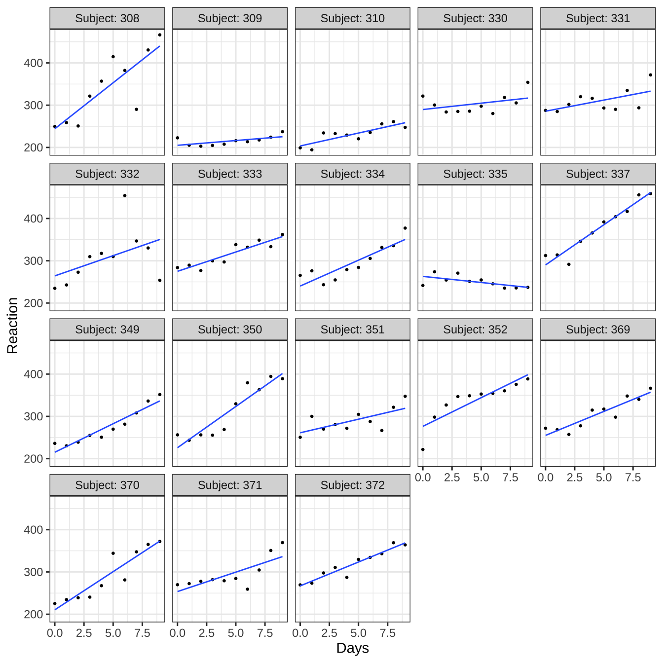 보기 10.1 (트럭운전사의 수면시간) lme4 패키지에 자료인 spleepstudy는 화물트럭 운전사들에 대한 수면부족 현상에 대하여 연구한 자료이다. 18명의 운전자들이 매일 3시간의 수면(부족한 수면)을 하면서 매일 일정한 동작의 반응시간을 10일동안 반복적으로 측정한 자료가 있다. 한명의 운전사에게 10일 동안의 반응에 대한 측정자료 10개가 존재하므로 이는 반복측정 자료이며 이러한 10개의 자료는 독립이 아니다. 일단 자료의 구조를 살펴보자. 반응변수 `Reaction은 반응시간(ms)를 나타내며 설명변수로서 Days는 날짜(\(t=0,1,2,\dots,9\)), Subject 는 운전자의 고유번호를 나타낸다.