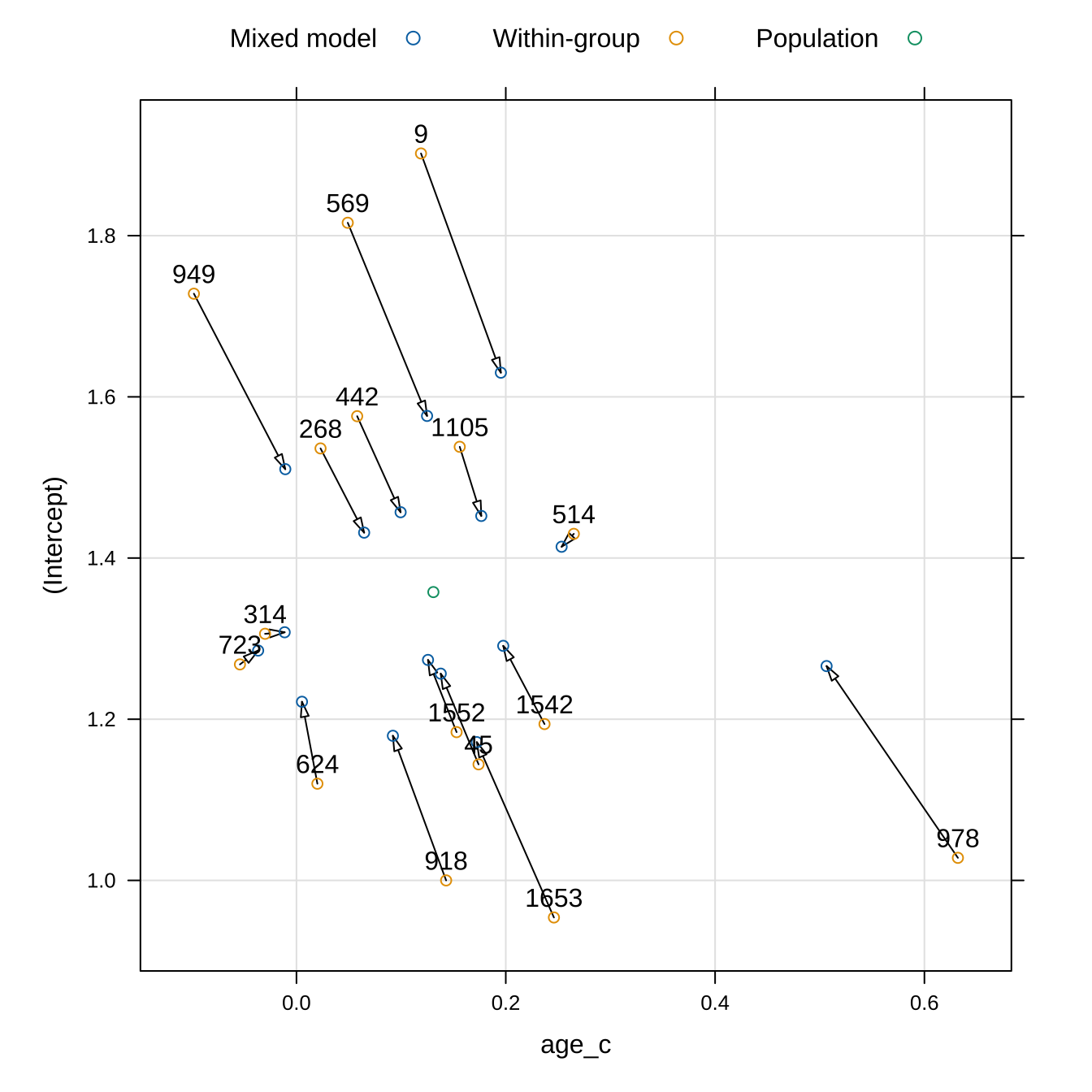 이제 임의계수 모형에서 추정한 개인별 절편과 기울기를 개체별 선형회귀 모형에서의 추정치와 비교해 볼 수 있다. 아래 그림은 sleepstudy 와 유사하게 임의계수 모형에서 추정한 개인별 절편과 기울기가 개별 회귀모형에 비하여 전체 평균으로 축소되는 경향을 나타낸 그림이다.