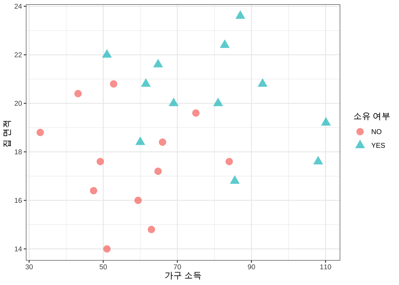 즉, income 과 lotsize가 각각 70, 16 이면 \(\pmb a^t \pmb x_0 > m\) 을 만족하므로 트렉터를 소유하지 않을 그룹 (NO) 에 속한다고 판별한다.