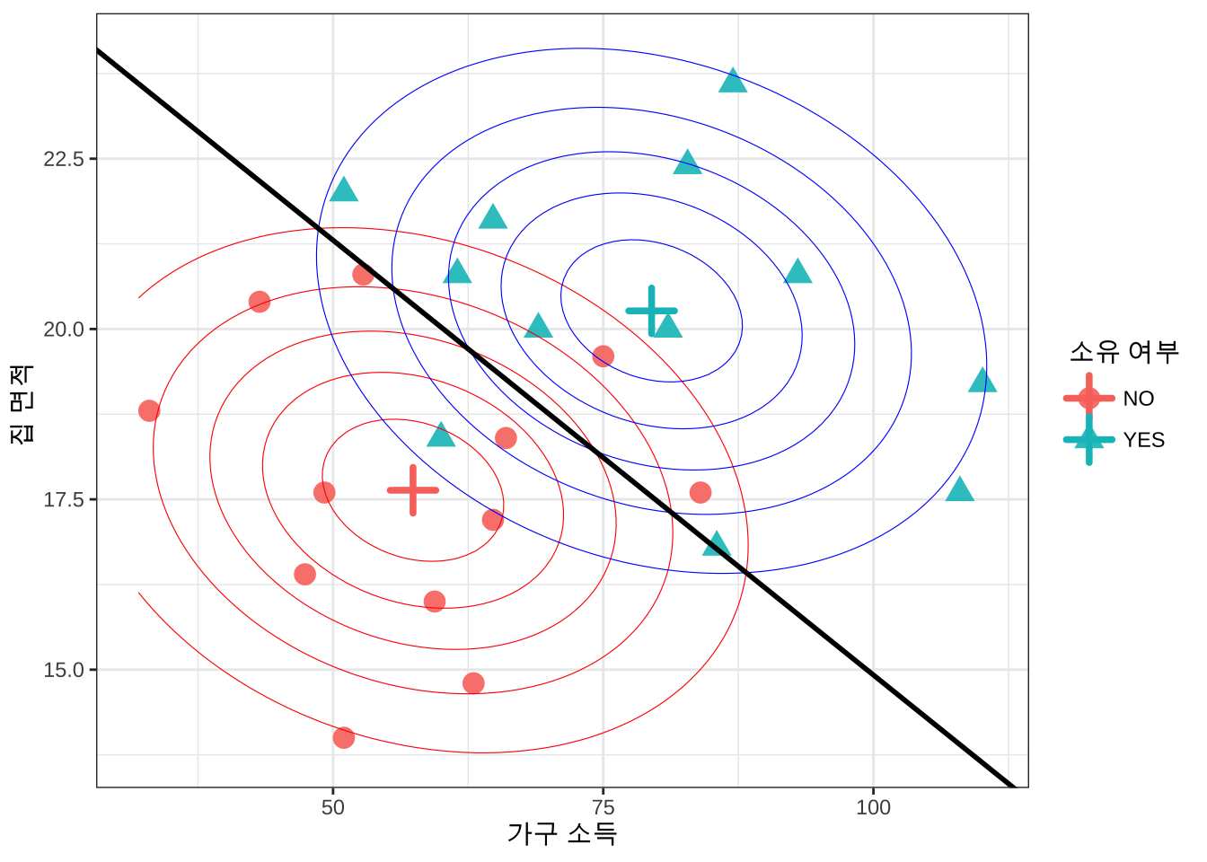 트랙터를 소유한 집단과 소유하지 않은 집단에서 소득과 집크기에 대하여 이변량 정규분포를 가정하고 각 집단의 평균벡터와 공통 공분산을 구하여 이변량 정규분포의 확률밀도함수를 이차원 평면에 표시해보았다. 또한 앞에서 구한 선형 판별함수의 경계선 \(\pmb a^t \pmb x = m\) 을 표시하였다