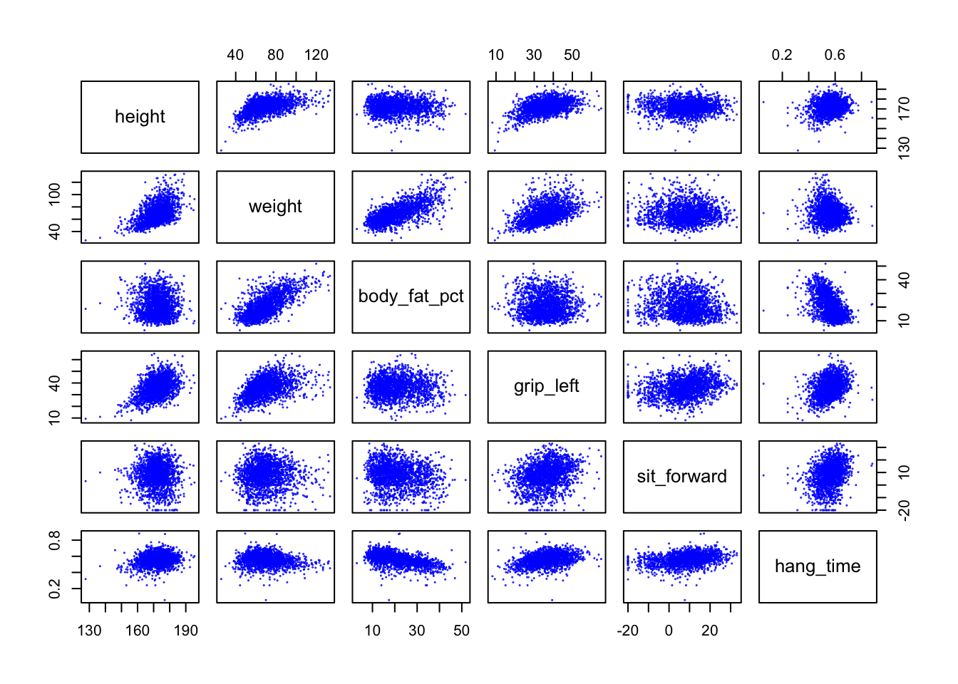 select(height, weight, body_fat_pct, grip_left, sit_forward,hang_time)